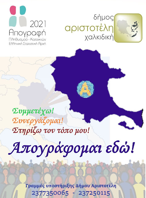 Σε καμπάνια ενημέρωσης δημοτών και κατοίκων του, με το μήνυμα «απογράφομαι εδώ», καθώς και στη δημιουργία Help Desk με δύο τηλεφωνικές Γραμμές Υποστήριξης για την υποβοήθηση του έργου της Απογραφής του 2021, που εξελίσσεται ήδη από την Ελληνική Στατιστική Αρχή, προχωρά ο Δήμος Αριστοτέλη, αναδεικνύοντας τη σημασία της καθολικής συμμετοχής των πολιτών στη διαδικασία.